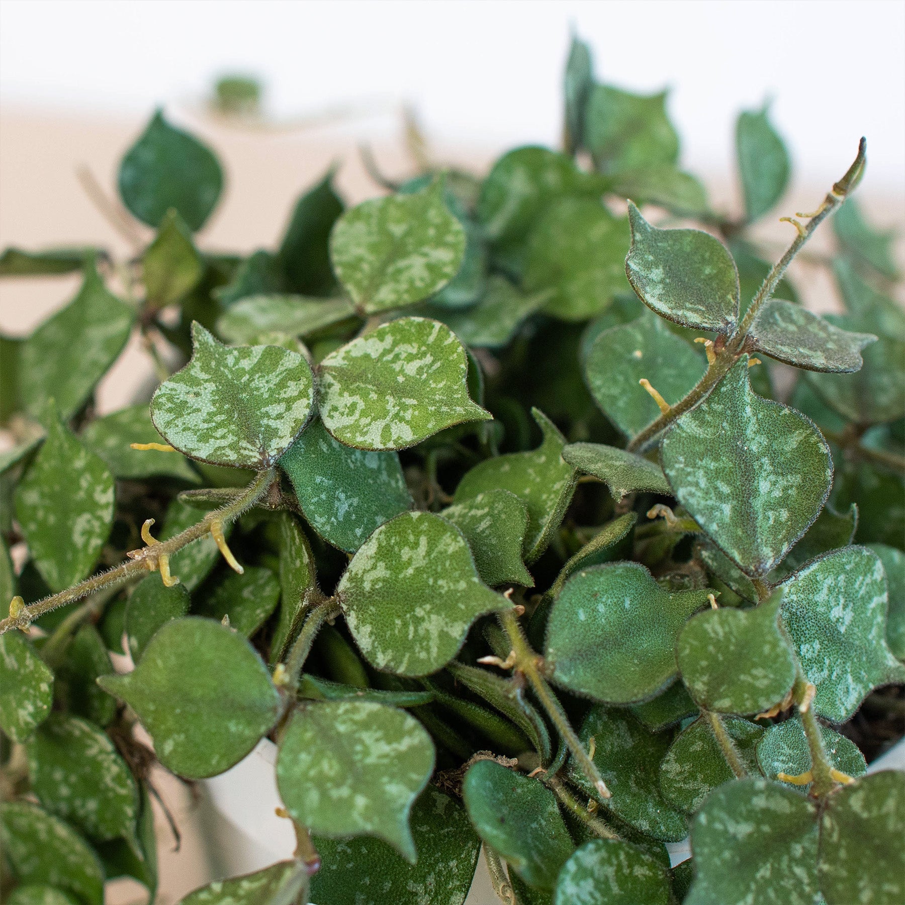 - Description: Hoya curtisii is a miniature trailing hoya. This form of curtisii has small round olive green leaves mottled with grey. The apex is pointed on the thick succulent leaves. This will make a tight mat over the soil surface and then hang down.